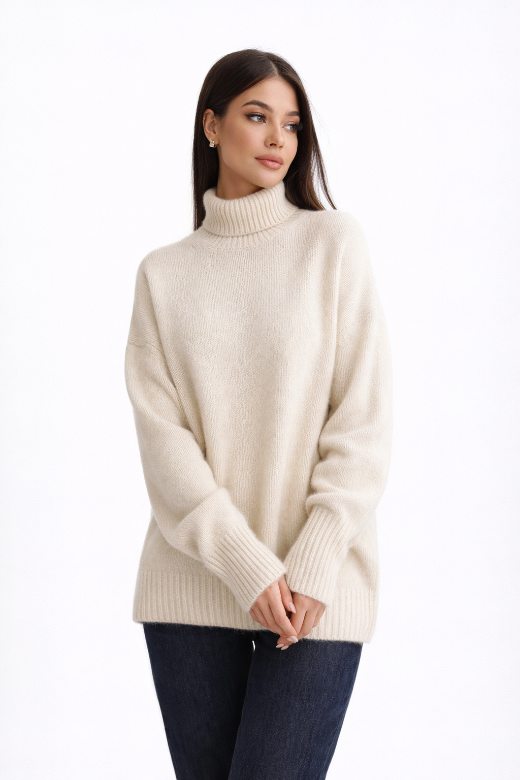 Cachemira suave y ligera con calidez natural · Diseño de cuello alto elegante y atemporal · Prenda versátil para looks casuales y formales · Sensación de lujo y confort en cada uso