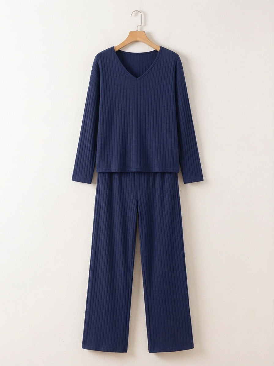 Conjunto cómodo y elegante para cualquier ocasión. Diseño moderno con textura acanalada. Escote en V que estiliza la silueta. Pantalón de corte amplio muy favorecedor. Ideal para usar en casa o para looks casuales.